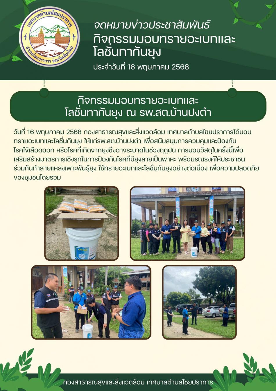 วันที่ 16 พฤษภาคม 2568 กองสาธารณสุขและสิ่งแวดล้อม มอบทรายอะเบทและโลชั่นกันยุง ให้แก่รพ.สต.บ้านปงตำ [16 พฤษภาคม 2568]