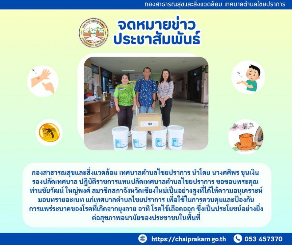 ท่านชัยวัฒน์ ใหญ่พงศ์ สมาชิกสภาจังหวัดเชียงใหม่เป็นอย่างสูงที่ได้ให้ความอนุเคราะห์ มอบทรายอะเบท แก่เทศบาลตำบลไชยปราการ [14 พฤษภาคม 2568]