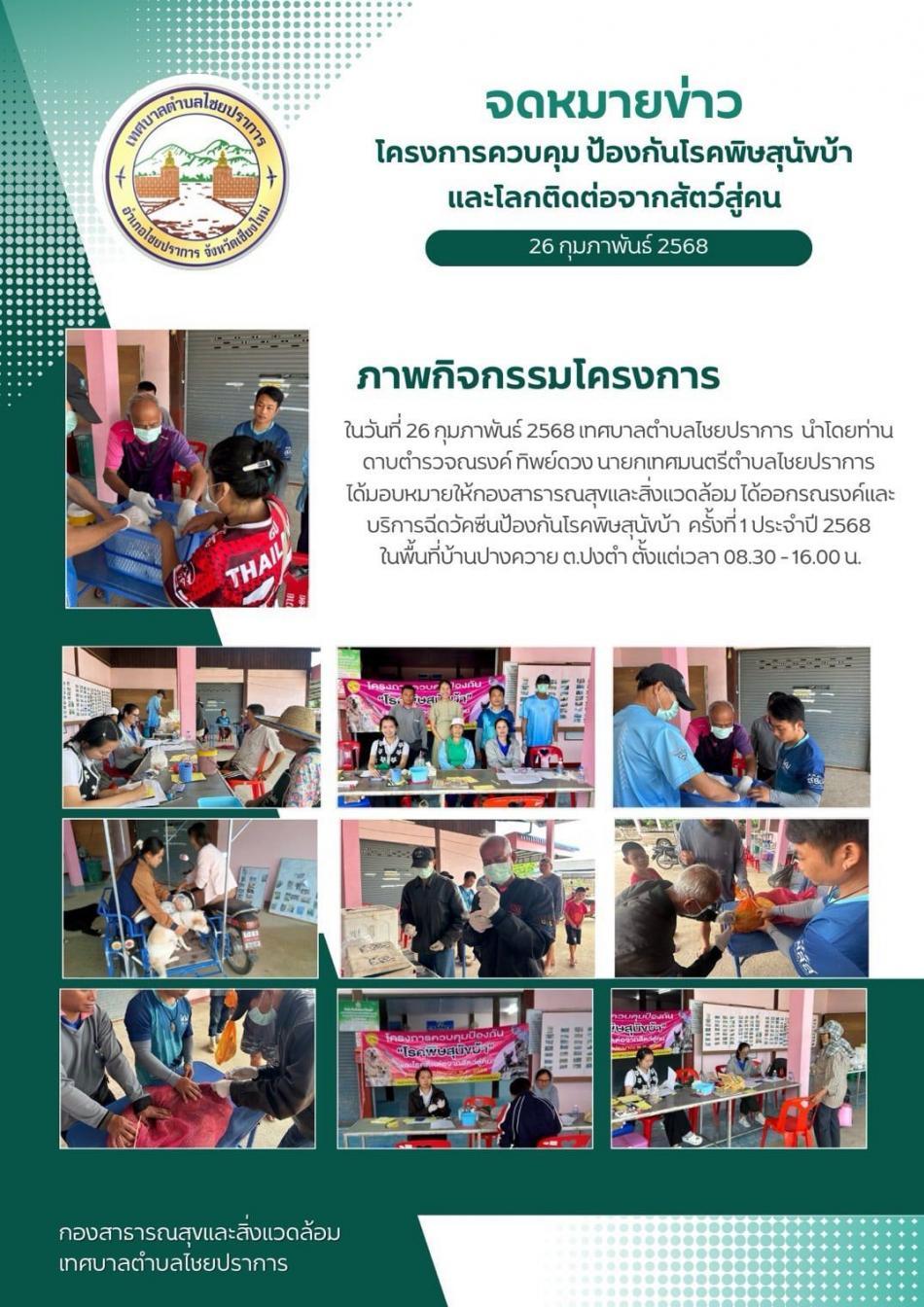 ในวันที่ 26 กุมภาพันธ์ 2568 ออกรณรงค์และบริการฉีดวัคซีนป้องกันโรคพิษสุนัขบ้า [26 กุมภาพันธ์ 2568]