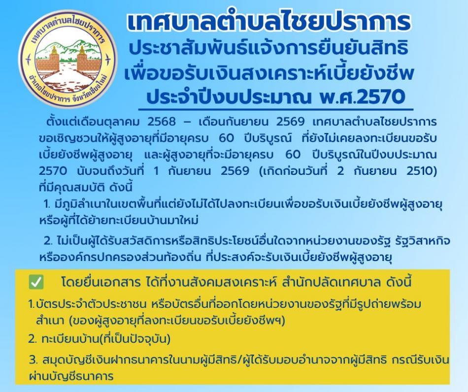 งานสังคมสงเคราะห์ สำนักปลัดเทศบาลตำบลไชยปราการ แจ้งประชาสัมพันธ์ การยืนยันสิทธิเพื่อขอรับเงินเบี้ยยังชีพผู้สูงอายุ ประจำปีงบประมาณ พ.ศ.2570 [2 ตุลาคม 2568]